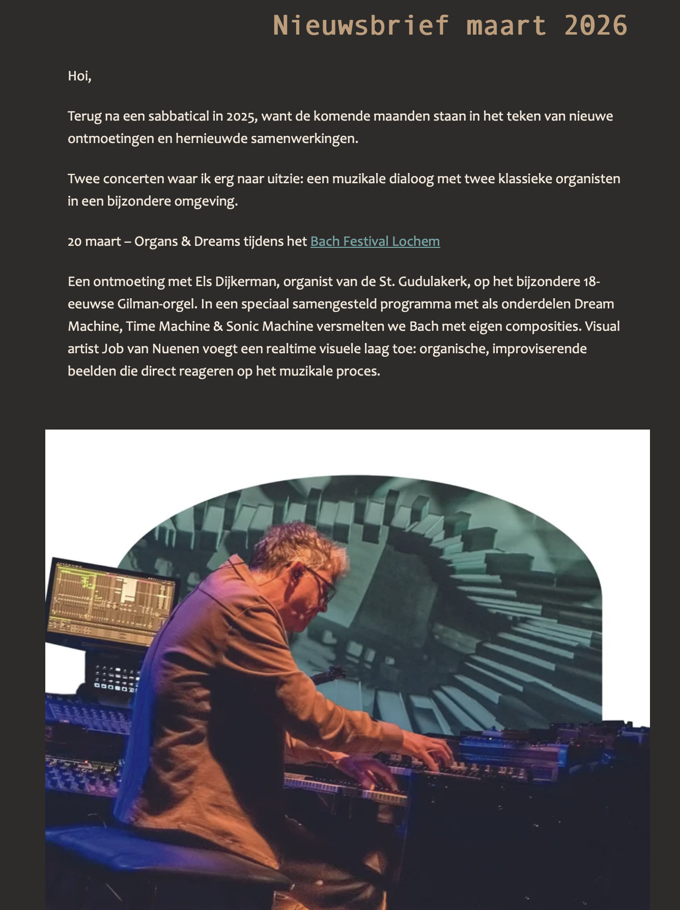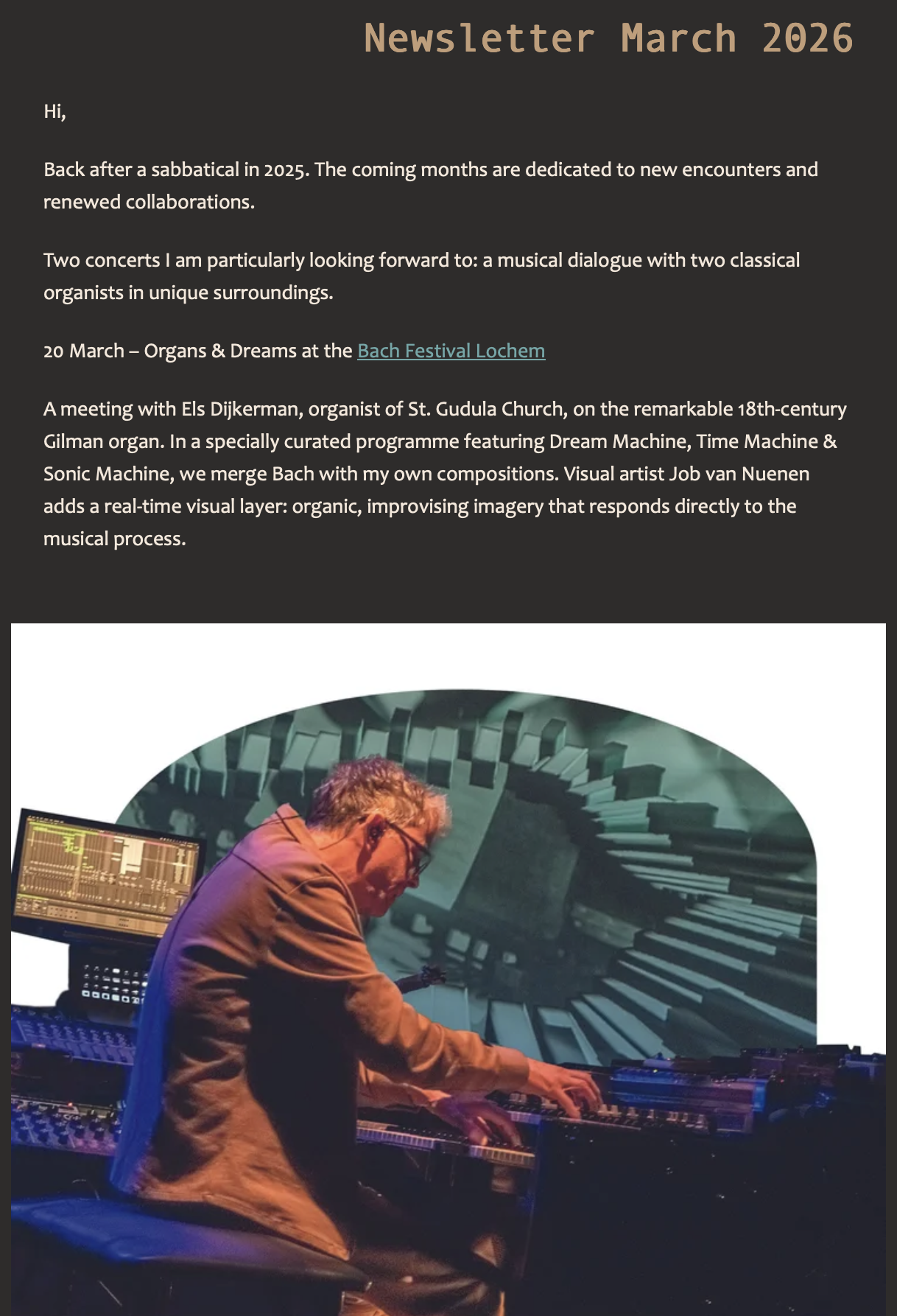His most recent project is Sonic Dimension, with hybrid drummer Jordi Geuens and visual artist Job van Nuenen, explores the intersections of (live) music, visual art, and technology, building on the foundations laid by the New Hammond Sound Project (NHSP) since 2016.